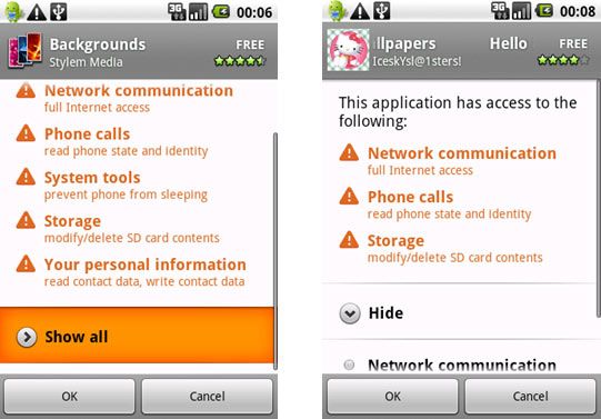 U Android OS-u se prije same instalacije prikazuje lista dozvola koja određena aplikacija zahtjeva. Pritiskom OK, odnosno instaliraj, aplikacija se instalira uz omogućavanje pristupa svim dijelovima sustava koji su bili navedeni u listi. Dakle, instalacijom smo aplikaciji omogućili prolazak "kroz" kernel i komunikaciju s hardverskim komponentama mobitela.