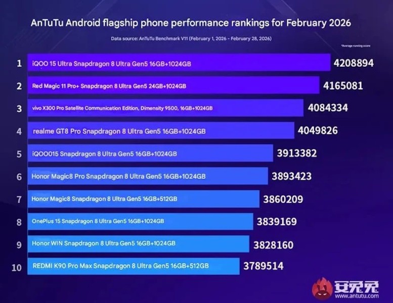 Ostatak ljestvice za veljaču ukazuje na apsolutnu dominaciju Qualcomma. Od četvrtoplasiranog modela Realme GT 8 Pro pa sve do Redmi K90 Pro Max na desetom mjestu, svi uređaji koriste Snapdragon 8 Elite Gen 5.