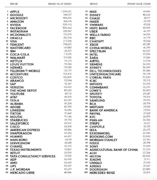 Izvještaj pokazuje da brendovi koji su “uzdrmali” tržište donose najviše vrijednosti, recimo Uber, Booking.com, ChatGPT, ali i stari igrači poput Applea, Amazona, Googlea i Microsofta. Apple je i dalje broj jedan, s vrijednošću brenda od čak 1,3 bilijuna dolara, dok je Amazon skočio za 50%, na 866 milijardi dolara. Instagram i TikTok isto također rastu ogromnom stopom.