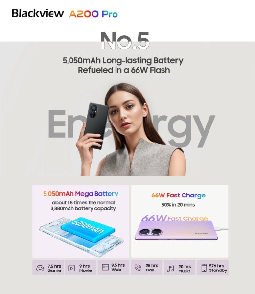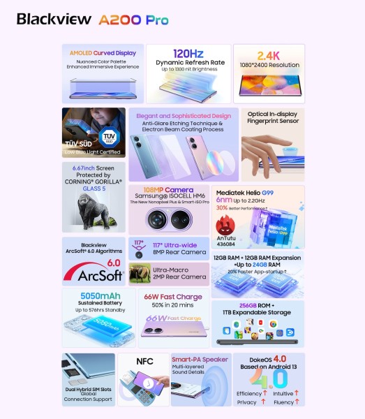 Blackview, tehnološka tvrtka u razvoju, od svog osnutka predana je ponudi vrhunskih proizvoda i usluga za korisnike. Dok je njegova serija A dobila brojne pohvale zbog svog estetskog dizajna i vrhunskih fotografskih mogućnosti, ona teži daljnjem napretku u neumoljivoj potrazi za inovacijama i dubljem uvidu u želje kupaca. Nakon godina renoviranja, nedavno je ova tvrtka lansirala svoj najnoviji poslovni model, nazvan A200 Pro, s glavnom kamerom od 108 MP i naprednim Blackview ArcSoft® 6.0 algoritmima, 2.4K 120Hz AMOLED zakrivljenim zaslonom, poslovno prilagođenim DokeOS 4.0, 6nm Helio G99 procesorom, baterijom od 5050 mAh i podrškom za brzo punjenje od 66 W.