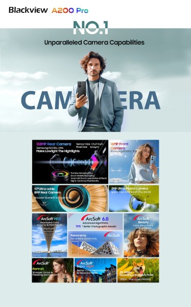 Blackview vidi sve veću potražnju za visokokvalitetnom fotografijom u modernom dobu. Što se tiče kamera, A200 Pro će sadržavati 16MP Samsung® selfie kameru koja će korisnicima omogućiti snimanje savršenih selfieja u zatvorenom i na otvorenom. Straga se može pohvaliti revolucionarnom postavom trostruke kamere od 108 MP, koja se sastoji od 108 MP Samsung® ISOCELL HM6 1/1.67” velike kamere (nova Nonapixel Plus tehnologija) zajedno s 8 MP 117° širokokutnom lećom i 2 MP ultra-makro senzorom.
