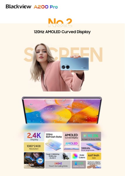 A200 Pro će imati 6,67-inčni AMOLED zakrivljeni zaslon s 2,4K visokom rezolucijom i dinamičkim osvježavanjem od 120Hz, koji nudi zadivljujuću vjernost boja. Više od toga, Blackview je također uložio napore za zdravlje očiju korisnika sa smanjenim štetnim plavim svjetlom kako bi svoj zaslon certificirao TÜV SÜD Low Blue Light certifikatom. Sa Smart-PA zvučnikom za višu kvalitetu zvuka, daje korisnicima još impresivnije i privlačnije audio-vizualno iskustvo da igraju uzbudljive igre, gledaju prijenose uživo ili uživaju u filmovima. Nadalje, zaslon će biti zaštićen CORNING® GORILLA GLASS 5 slojem za bolju otpornost na ogrebotine i pukotine.
