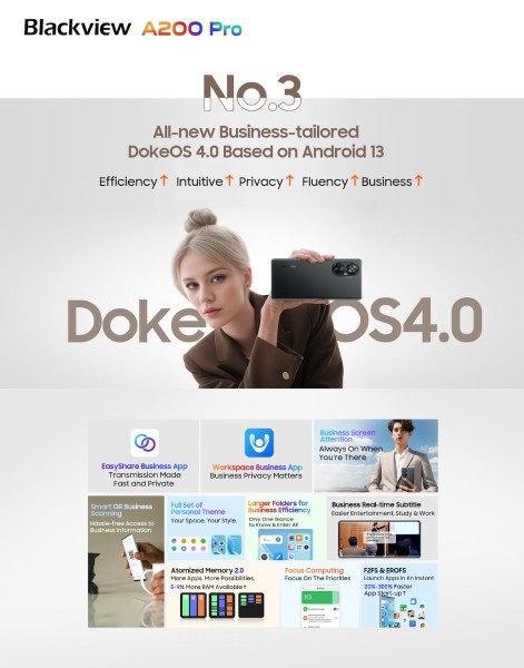 Kao što je službeno objavljeno, novododane aplikacije su EasyShare Business App koja korisnicima omogućuje dijeljenje datoteka različitih vrsta bez potrebe za mobilnim mrežama, a ipak brzinom većom od Bluetootha. Tu je i Workspace Business App za bolju ravnotežu između posla i privatnog života s dva pojedinačna prostora, gdje se podaci i datoteke mogu odvojiti. Nadalje, Blackview ide korak dalje s funkcijama kao što su Smart QR Business Scanning, Business Screen Attention i Business Real-time Subtitle. DokeOS 4.0 nudi više opcija personalizacije za korisnike da postave temu u poslovnom stilu po želji i prepoznatljiviju radnu površinu s velikim mapama. Uz dublje uvide za korisnike, Blackview je nadogradio DokeOS 4.0 u pogledu privatnosti temeljen na Androidu 13 s automatskim brisanjem povijesti međuspremnika i sofisticiranijim upravljanjem dozvolama.