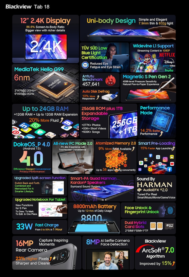 U usporedbi sa svojim prethodnikom, Tab 18 će ponuditi neke značajne nadogradnje. Ne samo da će imati ultra veliki 12-inčni 2.4K zaslon s WideVive L1 podrškom i potpuno novu magnetsku S Pen Gen 2 olovku, već će također sadržavati četiri nadograđena Harman Kardon zvučnika podešena Harman AudioEFX® 2.0 sustavom. Ispod haube, Tab 18 može se pohvaliti glatkijim 6nm Helio G99 čipsetom, do 24 GB RAM-a, 256 interne memorije, proširenjem TF karticama do 1 TB i impresivnom baterijom od 8800 mAh. Tu su i kamere od 8 MP i 16 MP koje pokreće najnoviji algoritam ArcSoft® 7.0. Uređaj radi na potpuno nadograđenom DokeOS_P 4.0 temeljenom na Androidu 13 donosi potpuno novi PC način rada 2.0. Tab 18 ima za cilj pružiti korisnicima sveobuhvatniju audiovizualni užitak i pametniji, praktičniji i učinkovitiji stil života s ultra velikim zaslonom.