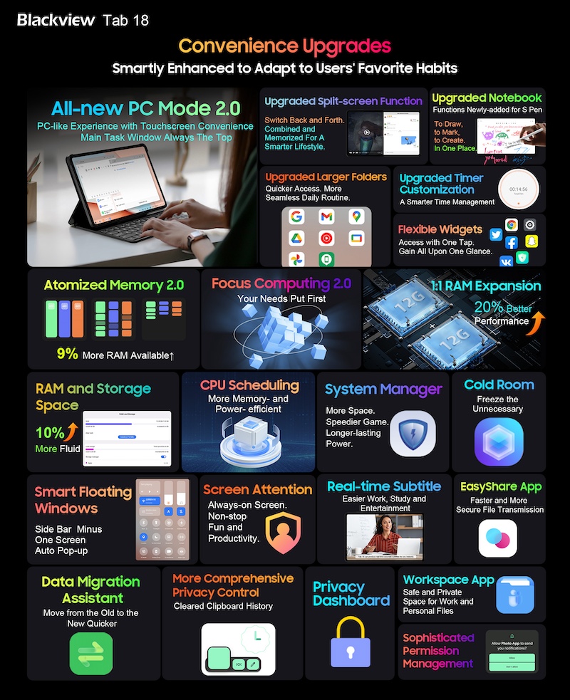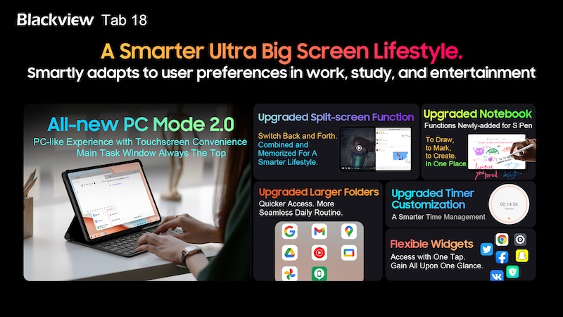 Kako bi zadovoljio sve veću potražnju korisnika za praktičnim, učinkovitim i pametnim iskustvom ultra velikog zaslona na poslu, učenju i zabavi, Blackview Tab 18 je predstavio svoj najnoviji DokeOS_P 4.0 temeljen na Androidu 13 poboljšan za prilagođavanje omiljenim navikama korisnika putem značajki kao što je nadograđena funkcija podijeljenog zaslona, potpuno novi PC način rada 2.0 i nadograđena prilagodba mjerača vremena.