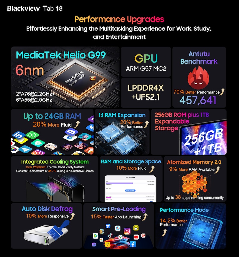 Kako bi osigurao da korisnici uživaju u besprijekornom iskustvu, bilo da rade, pohađaju online nastavu ili gledaju HD video zapise, Blackview je predstavio svoj vodeći tablet, Tab 18. Pokreće ga osmojezgreni MediaTek Helio G99 procesor, izgrađen u 6nm procesu, s radnim do 2,2 GHz. Ovaj procesor osigurava fluidne performanse, bilo da se radi o pokretanju zahtjevnih aplikacija, igranju ili multitaskingu. S poboljšanjima procesora i paketom značajki za optimizaciju performansi, kao što je proširenje RAM-a 1:1, atomizirana memorija 2.0 i pametno prethodno učitavanje, Tab 18 postiže impresivan AnTuTu rezultat od 457 641 bodova — nevjerojatno povećanje od 70% u odnosu na svog prethodnika. Dodatno opremljen s do 24 GB RAM-a, 256 GB ROM-a i podrškom za proširenje TF karticom do 1 TB, Tab 18 ne samo da pruža glatko korisničko iskustvo, već nudi i obilje pohrane za fotografije, videozapise i dokumente, zadovoljavajući širok raspon potreba za rad, učenje i zabavu.