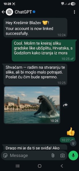 U međuvremenu, osobno sam testirao generiranje slika, a funkcija je počela raditi tek nakon povezivanja WhatsApp broja s mojim osobnim ChatGPT računom. OpenAI navodi ograničenje od jedne slike dnevno za nepovezane račune. Prvi pokušaj bez povezanog računa je uspio generirati sliku, a onda je zatražio povezivanje, što je izpalo iznomno jednostavno. Ponudio je link na kojeg sam kliknuo i na ChatGPT aplikaciji sam samo potvrdio povezivanje.