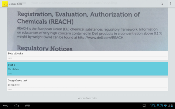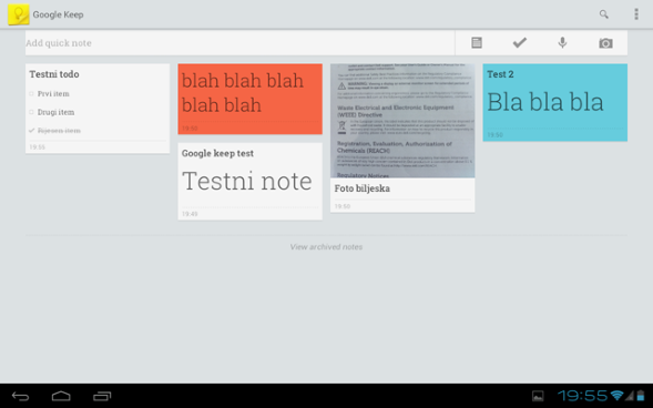 Swipanjem lijevo, odnosno desno moguće je arhivirati bilješke, a dugim pritiskom na neku od njih omogućeno je i razmještanje.