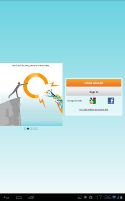 Pokretanjem Catcha ugodno iznenađuje mogućnost izrade novog računa ili logiranje s Facebook ili Google računom, a kao dodatak tu je i opcija za probu aplikacije bez računa.