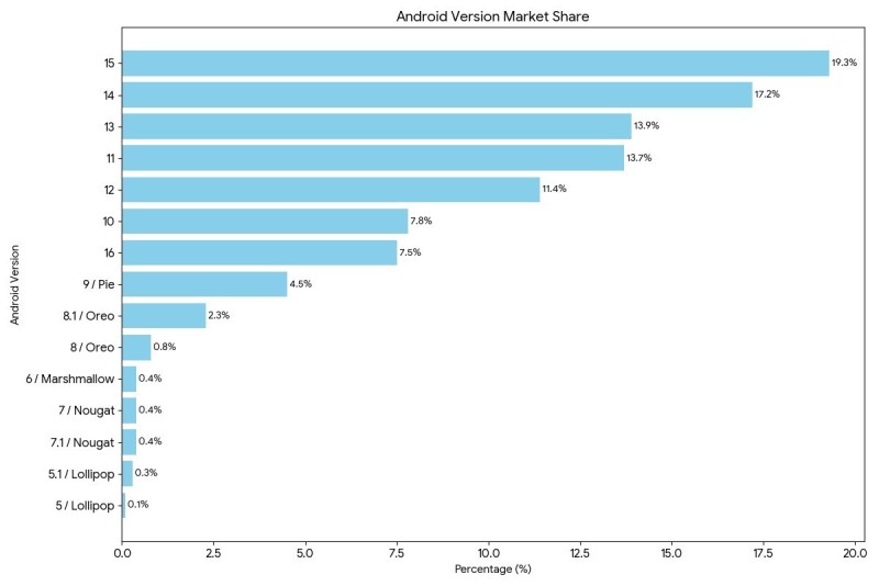 Trenutni tržišni lider je Android 15, koji drži najveći dio kolača s 19,3 % udjela. Slijede ga Android 14 sa 17,2 % i Android 13 s 13,9 %. Zanimljiv je, ali i pomalo poražavajući podatak da se Android 16 trenutno nalazi tek na sedmom mjestu po zastupljenosti. Ispred njega su se, osim navedenih, zadržale čak i starije verzije poput Androida 10, 11 i 12, što svjedoči o dugovječnosti starijeg hardvera, ali i problemu softverske podrške jeftinijih uređaja.