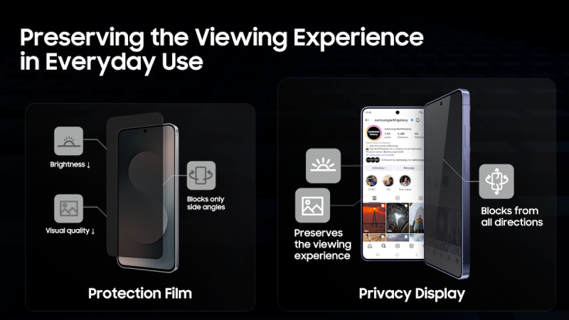 Na Galaxy S26 Ultra uređaju, Privacy Display nije samo softverski prekidač. U postavkama (Settings > Display) možete aktivirati Maximum privacy protection, što pojačava učinak sužavanja kuta vidljivosti.