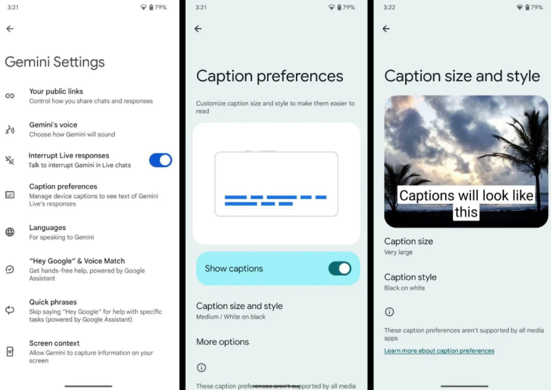 Google je dodao i mogućnosti prilagodbe izgleda titlova, pa korisnici sada mogu u postavkama Gemini aplikacije pod opcijom „Caption preferences” mijenjati stil i veličinu titlova prema vlastitim potrebama.