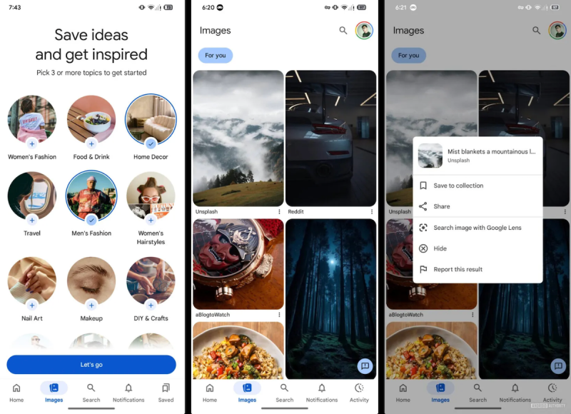 Prilikom prvog otvaranja kartice, korisnici će biti pozvani da odaberu barem tri interesna područja, kao što su Moda, Hrana i piće ili Uređenje interijera Na temelju tih izbora, Google će iz javnih rezultata pretraživanja sastavljati personalizirani feed slika.