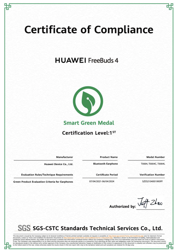 Huwei FreeBuds 4 certificirane su kao zeleni pametni proizvod, čime je Huawei osigurao zdravlje i sigurnost korisnika prilikom korištenja proizvoda te smanjio utjecaj na okoliš.