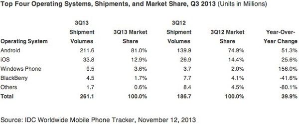 IDC je još jednom izašao s rezultatima istraživanja tržišta smartfona i u najnovijem izvještaju koji se odnosi na treći kvartal 2013. godine navodi da Android i dalje drži dominantnu poziciju s 81,1% tržišnog udjela, dakle više od četiri petine, uz dvostruko povećanje isporuka u odnosu na isto razdoblje prošle godine. Udio iOS-a je s lanjskih 14,4% pao na 12,9%, uz rast isporuka od 25,6%, dok je Windows Phone zauzeo 3,6% tržišta. Treba reći da su isporuke Windows Phone uređaja u odnosu na treći kvartal prošle godine skočile za čitavih 156%, no tržišni udio je još uvijek relativno mali.