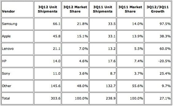 U trećem kvartalu na vrhu je bio Samsung s tržišnim udjelom od 21,8%, dok je Apple zauzeo drugo mjesto s 15,1% tržišnog udjela. Lenovo na trećem mjestu ostvaruje 7% udjela, a HP na četvrtom 4,6%.