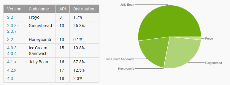 Najnovije statistike o raspodijeli pojedinih verzija Androida govore da se na više od polovici Android uređaja nalazi neka od verzija Jelly Beana. Točnije, ukupno 52.1% pripada verzijama 4.1.x, 4.2.x ili 4.3, a slijede verzije Gingerbreada 2.3.3 - 2.3.7 sa 26.3% te Ice Cream Sandwich (4.0.3 i 4.0.4) sa 19.8%.