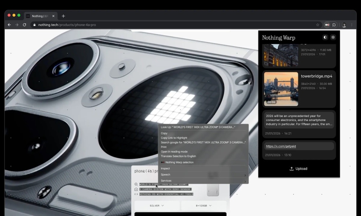Zamišljen kao univerzalna alternativa Appleovom AirDropu, Nothing Warp osmišljen je za brzu i jednostavnu razmjenu datoteka, poveznica i kopiranog teksta između Android pametnih telefona i računala na Windows, macOS i Linux operativnim sustavima.