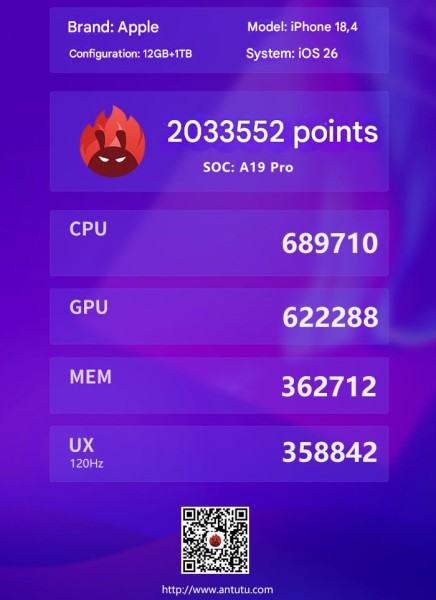 Jedan od prvih rezultata na AnTuTu platformi pokazuje da A19 Pro postiže 2.033.552 boda, što predstavlja tek blago poboljšanje u odnosu na prošlogodišnji A18 Pro, čiji je rezultat bio nešto ispod dva milijuna. Isprva se smatralo da rezultat pripada modelu 17 Pro, no AnTuTu je naknadnom ispravkom potvrdio da je testiran novi iPhone Air, koji nosi oznaku modela iPhone 18,4 i koristi isti čip. Taj detalj ne mijenja suštinu zaključka, ali pojašnjava neke razlike u pojedinačnim segmentima testa.