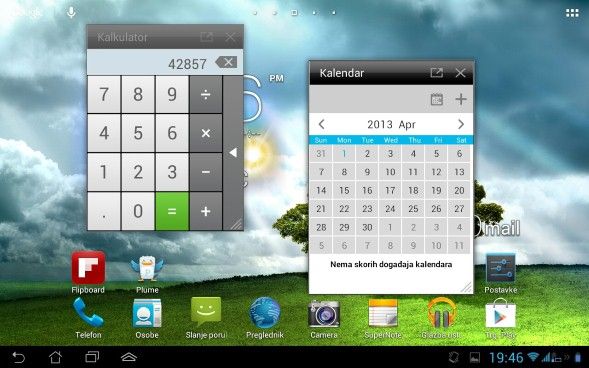 Tablet ima jedan zanimljiv dodatak, a to je mogućnost korištenja određenih aplikacija u malim prozorčićima koji plutaju iznad radne površine, po uzoru na Samsungov Multi view. Pritiskom na četvrtu funkcijsku tipku, na dnu se otvara izbornik s ovim aplikacijama koje jednostavnim odabirom možete dodati na radnu površinu. Ova mogućnost nije ograničena samo na aplikacije nego i na pojedine widgete. Ipak, ne podržava ju sve aplikacije ovu mogućnost, no one koje mogu biti od koristi su kalkulator, kalendar, sat, vrijeme, e-mail i sl. Svaku ovu plutajuću aplikaciju po potrebi u trenutku možete pretvoriti u "punokrvnu," dakle onu koja zauzima cijeli zaslon.