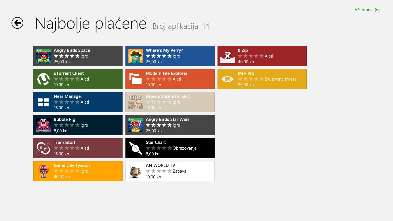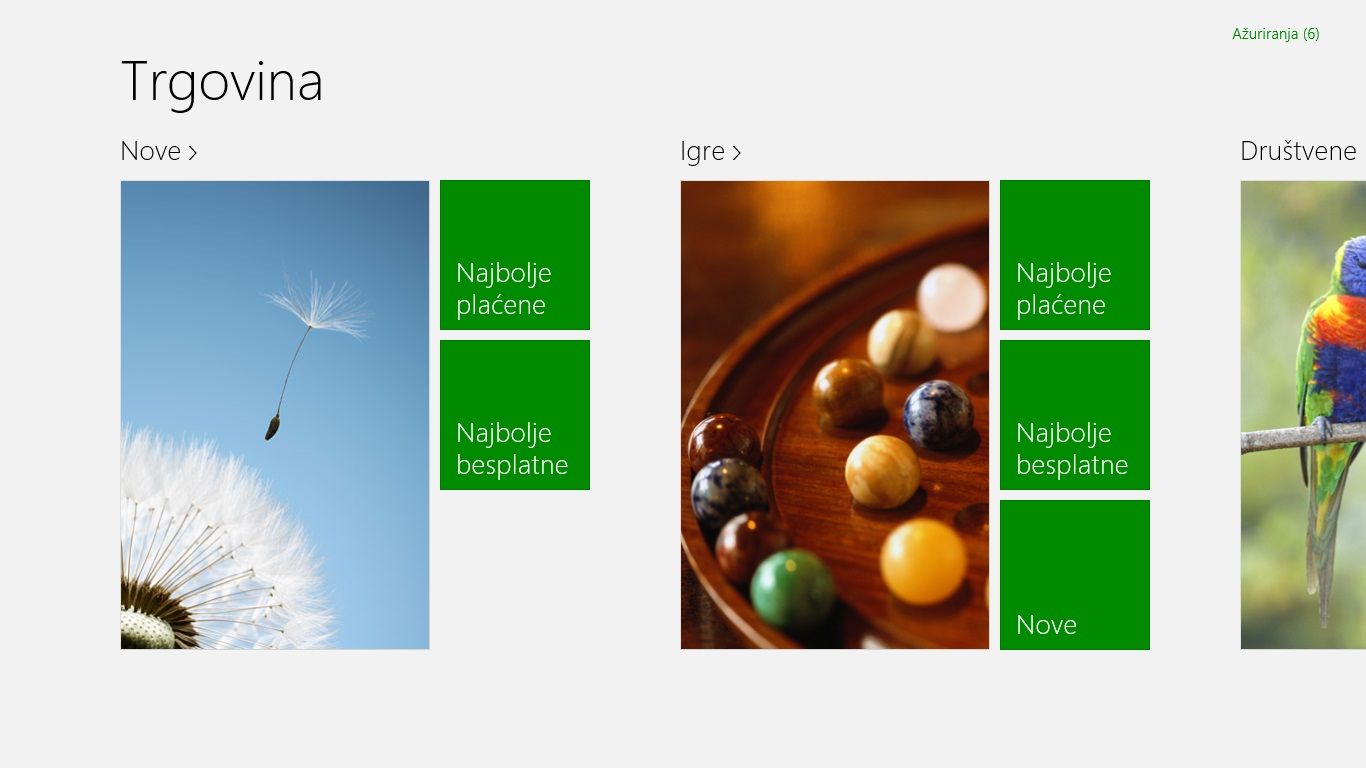 Windows sada ima svoju trgovinu aplikacijama pod nazivom Windows Trgovina (Windows Store). Kao i sve druge Modern UI aplikacije, prilično je jednostavnog izgleda s osnovnim postavkama. Budući da je ovaj uređaj namijenjen hrvatskom tržištu i s Windowsima na hrvatskom jeziku, inicijalno korištenje Windows trgovine vas može zbuniti. Naime, postavke su u startu podešene na olakšavanje pronalaska lokaliziranih aplikacija, što rezultira praktički nikakvom ponudom istih.