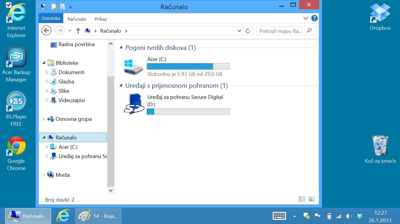 Dakle, ako na svom Windows 8 tabletu namjeravate gledati filmove, pripremite se na žongliranje raznim USB stickovima, memorisjkim karticama i sličnim napravama, a manje datoteke inače možete prebacivati putem Dropboxa, Skydrivea i ostalih cloud servisa. Direktnog prebacivanja kabelom s PC-a na tablet i obrnuto za sada nema. Budući da trenutno još uvijek ne znam kako se u ovom segmentu ponašaju drugi Windows 8 tableti, postoji izvjesna šansa da je problem u Aceru, no bilo bi nelogično da Windowsi tu mogućnost u osnovi podržavaju, a da ju je Acer iz nekog razloga izbacio.