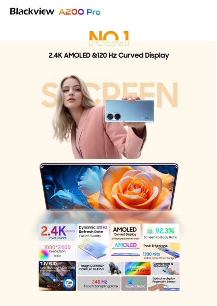 Za vrhunsko vizualni doživljaj, Blackview A200 Pro može se pohvaliti 6,67-inčnim 2,4K AMOLED zakrivljenim zaslonom, zaštićenim izdržljivim CORNING® GORILLA® GLASS 5 i poboljšanim dinamičkom brzinom osvježavanja od 120 Hz za glatke vizualne prikaze korisnika i brzinom uzorkovanja dodirom od 240 Hz za precizne igrica. Smart-PA Box zvučnik pruža bogat zvuk, dok optički senzor otiska prsta na zaslonu nudi brz i siguran pristup. Živahni zaslon, s maksimalnom svjetlinom do 1300 nita, ostaje jasan čak i na sunčevoj svjetlosti. Osim toga, TÜV SÜD za Low Blue Light certifikat osigurava smanjenu plavu svjetlost, dajući prednost udobnosti očiju korisnika.