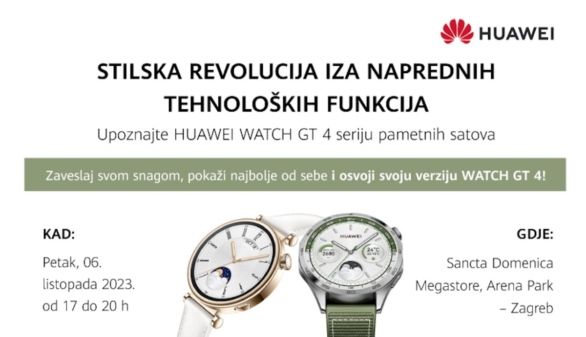 – Huawei će u petak 6.10.2023. u Sancta Domenica trgovini u Arena Parku u Zagrebu predstaviti HUAWEI WATCH GT 4, najnoviju generaciju svojih pametnih satova. WATCH GT 4 dolazi pod novim dizajnerskim smjerom nazvanim „Fashion Forward“, donoseći još veću integraciju tehnologije i mode te tako korisnicima pruža personaliziranije zdravstveno i sportsko putovanje. Uz to, impresivna baterija traje do dva tjedna za 46 mm modele odnosno do tjedan dana za 41 mm verzije, a inovativne zdravstvene značajke označavaju podignutu ljestvicu ovog segmenta tržišta pametnih uređaja.