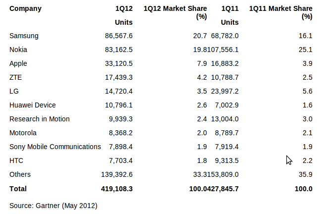 U prvom kvartalu 2012. godine u svijetu je ukupno prodano 419 milijuna mobitela što je 2% manje u odnosu na isto razdoblje prošle godine kada je ta brojka iznosila 427 milijuna. Ovo je prvi zabilježen pad od drugog kartala 2009. godine, na što je najviše utjecala smanjena potražnja u regiji Azija-Pacifik. Kad je raspodjela tržišnog kolača u pitanju iz tabele je vidljivo je da je Samsung preuzeo vodstvo i sada ima udio od 20,7%. Druga je Nokia s 19,8% udjela, a treći Apple sa 7,9%. Četvrti je kineski ZTE s 4,2%, peti LG sa 3,5, a šesti Huawei sa 2,6% udjela na globalnom tržištu. Zanimljivo je da je kanadski RIM sa svojim BlackBerryjima pao na sedmo mjesto s tek 2,4% udjela.