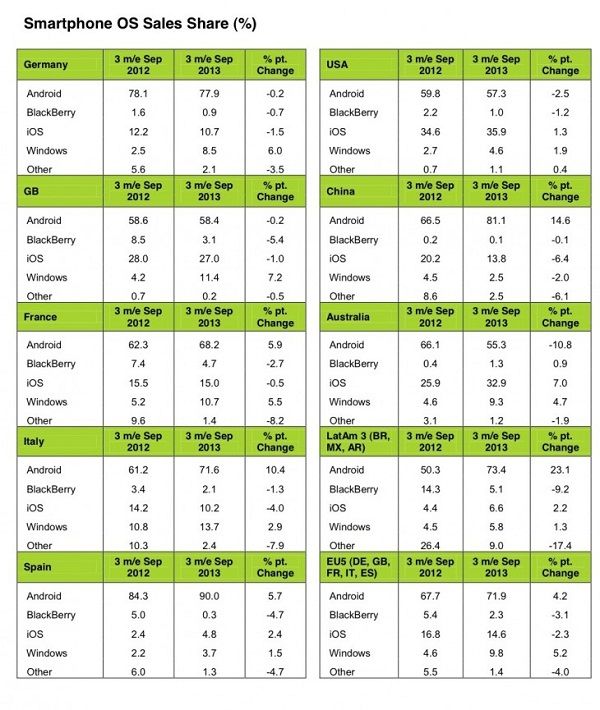 Na 5 najvećih europskih tržišta (Njemačka, Velika Britanija, Francuska, Italija i Španjolska) Windows Phone trenutno drži 9,8% tržišta smartfona, a u Italiji čak 13,7%, što je za 2,9 postotnih bodova više nego u istom razdoblju lani. iOS je u toj zemlji lani bilježio 14,2% udjela, da bi sada pao na 10,2%, što ga je na ljestvici popularnosti u trećem kvartalu ove godine smjestilo ispod Windows Phonea.