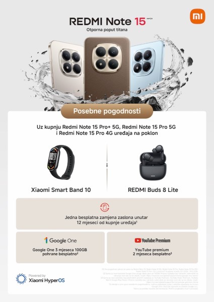 Kupnjom uređaja REDMI Note 15 Pro+ 5G, REDMI Note 15 Pro 5G ili REDMI Note 15 Pro 4G, uz poklon, korisnici dobivaju i dodatne pogodnosti: jednu besplatnu zamjenu zaslona unutar 12 mjeseci od kupnje, Google One s 100 GB pohrane besplatno tri mjeseca te YouTube Premium uslugu dva mjeseca besplatno.